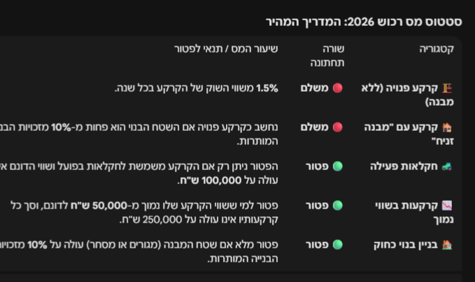 🚜 חקלאות פעילה 🟢 פטור הפטור ניתן רק אם הקרקע משמשת לחקלאות בפועל ושווי הדונם אינו עולה על 100,000 ש"ח.